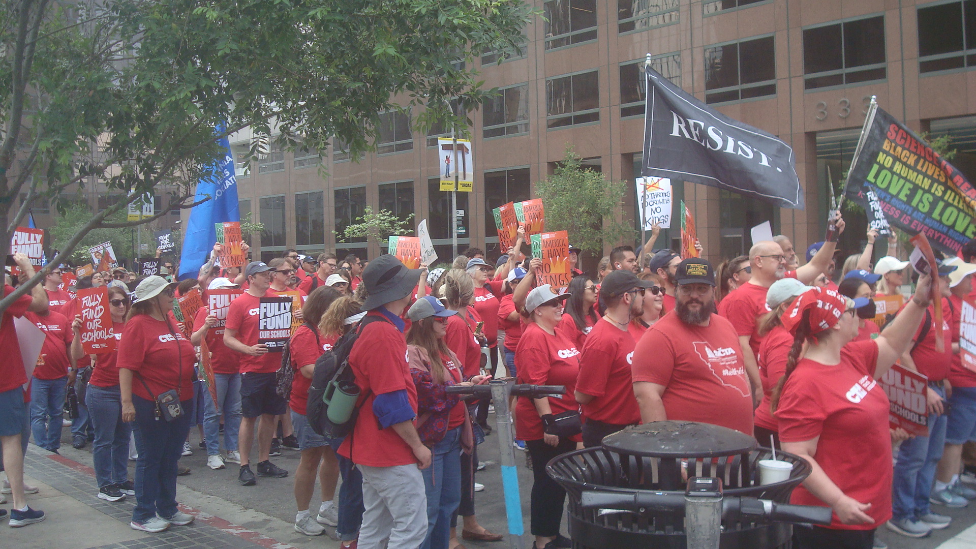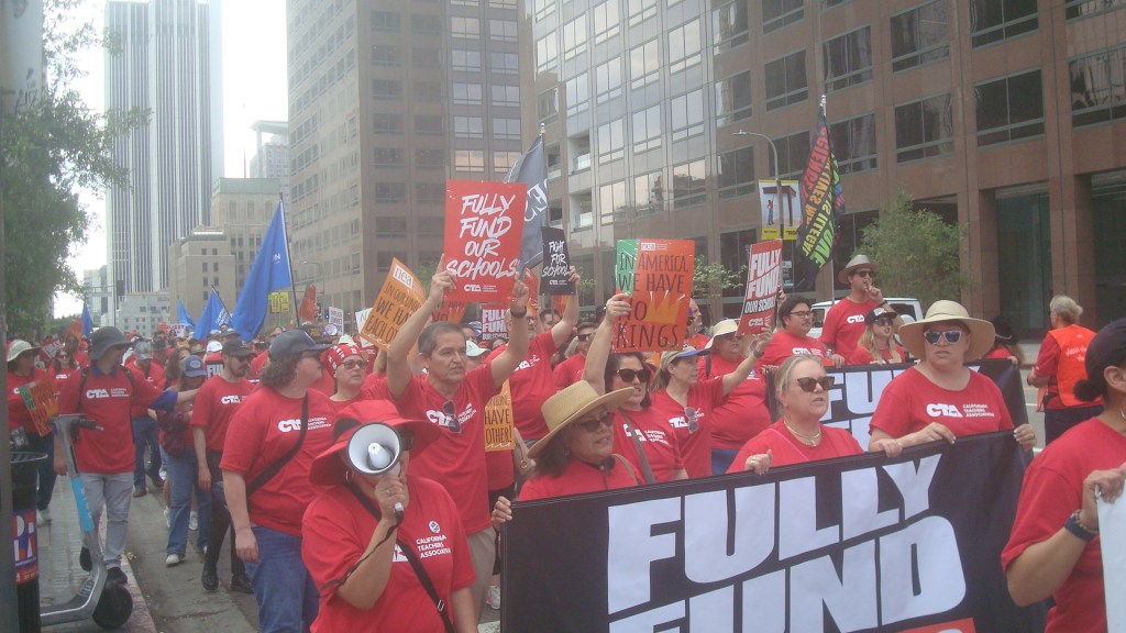 Teachers marching up Grand Ave. in Downtown LA.The march was well organized and the teachers shouted out slogans as they headed north on Grand.