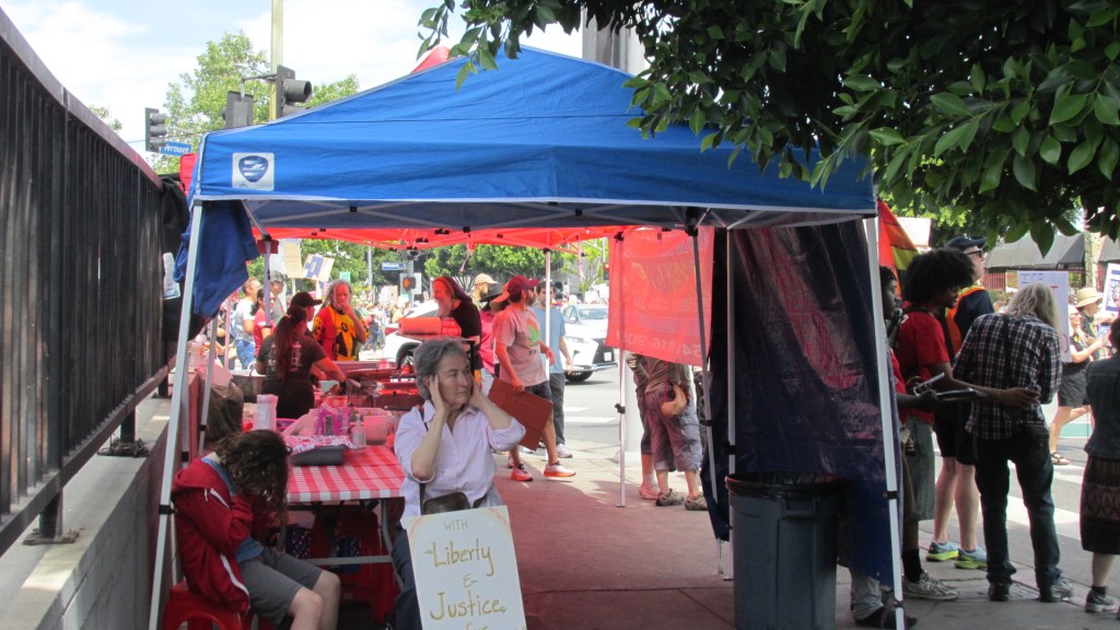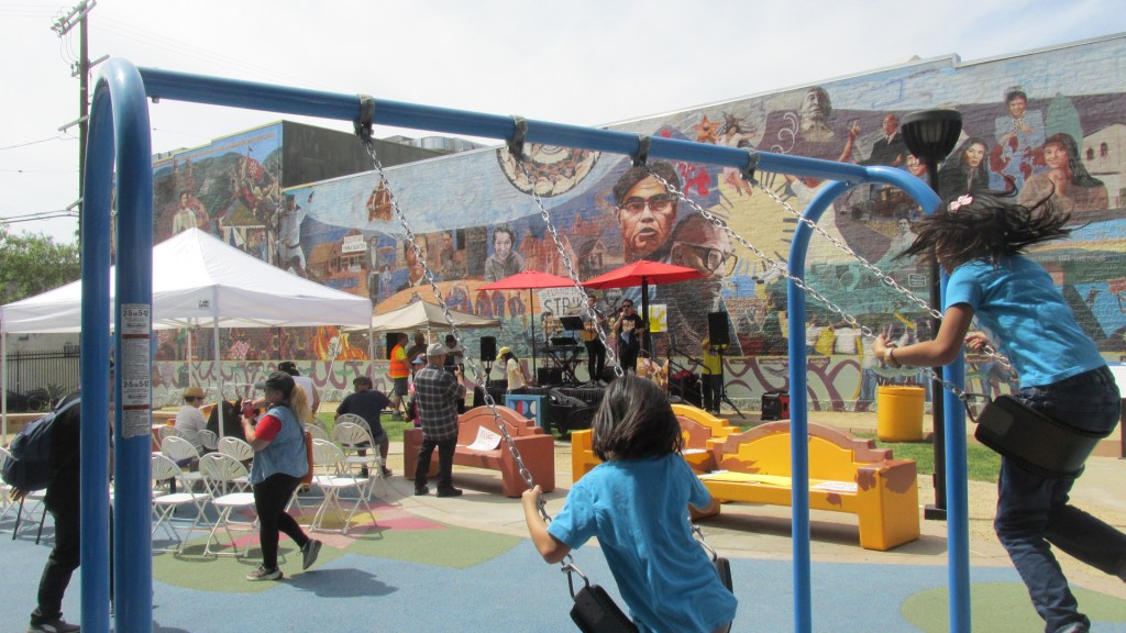 Then I went to small rally held in Unidad Park on Beverly in Filipinotown. I’d say between 50 and 100 people showed up to listen to speeches and music. A number of groups had tables set up where volunteers were engaging attendees on various issues. And some kids were having a great time on the swings.