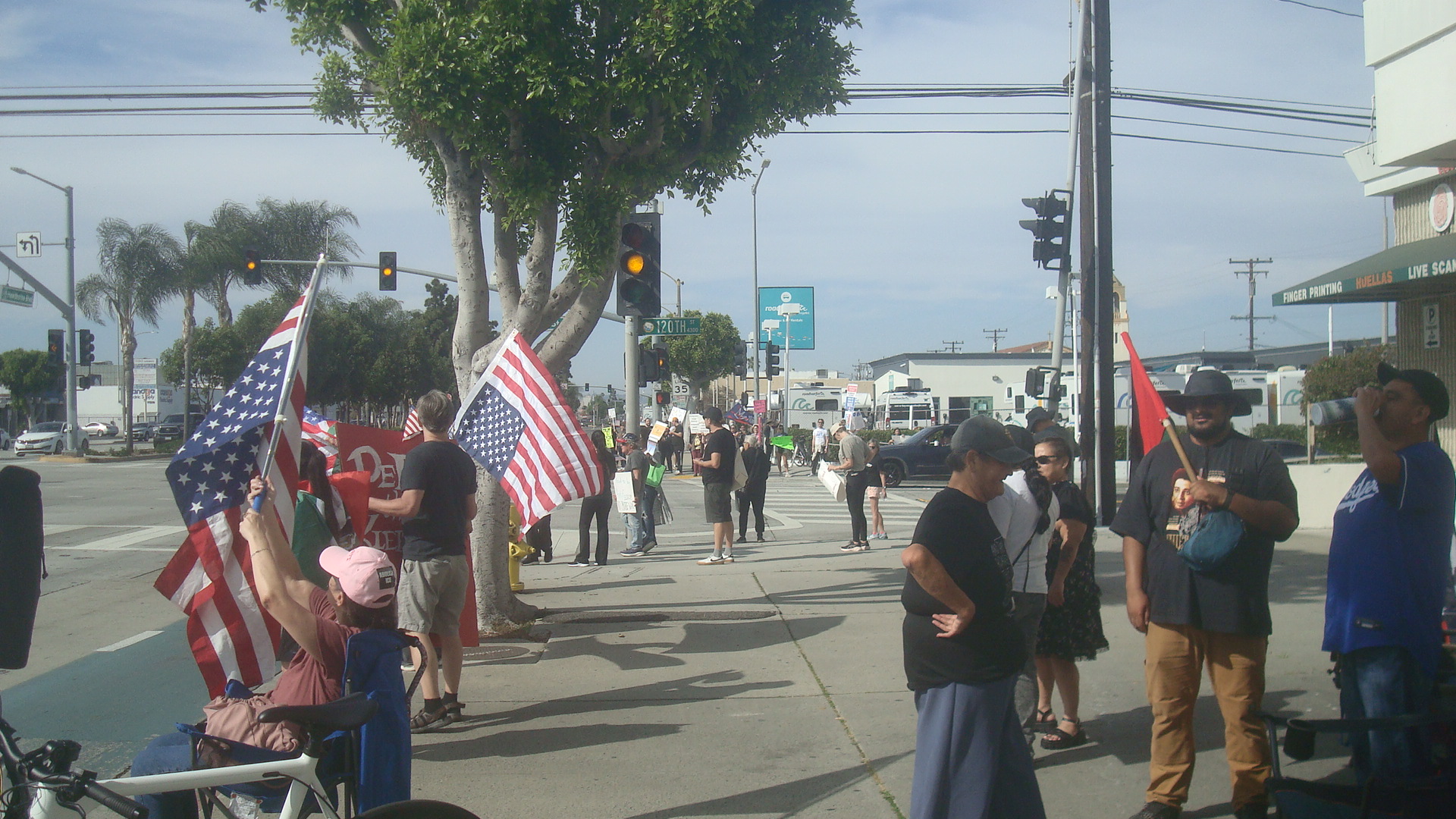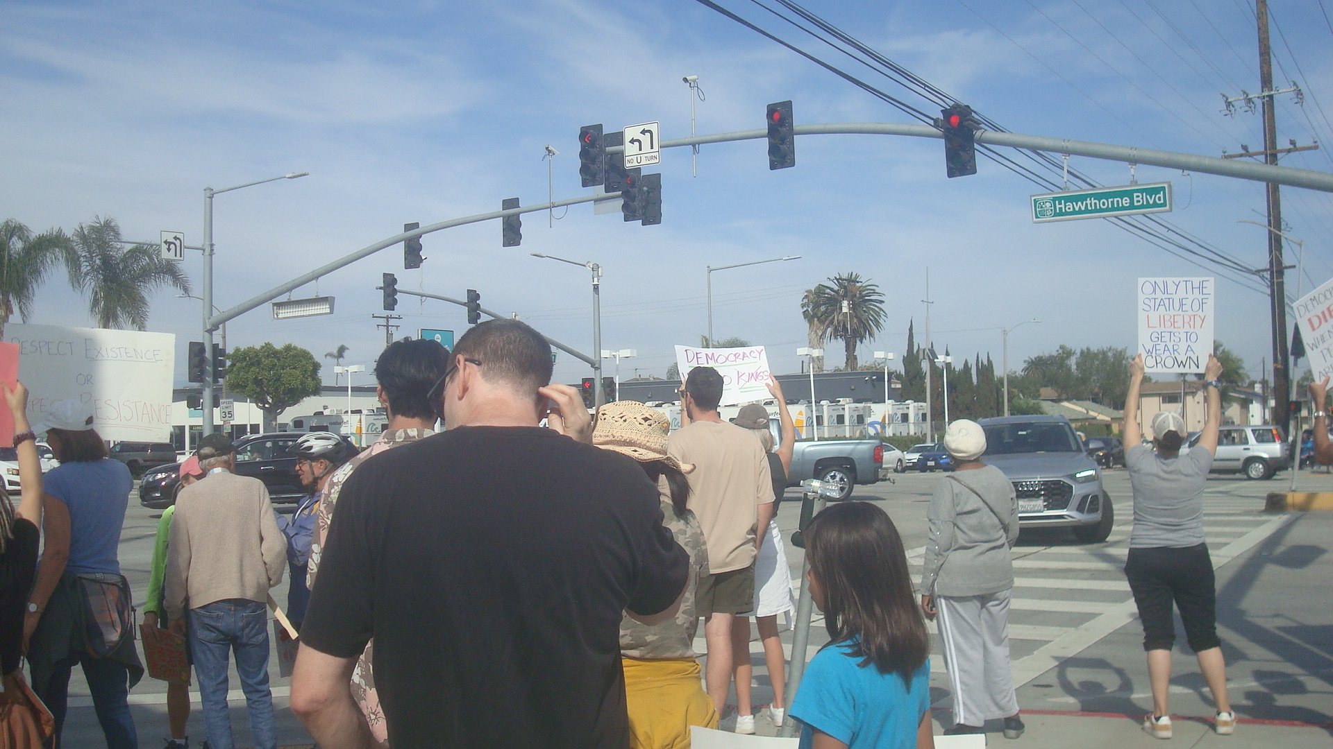 Then I headed down to Hawthorne, where a small but spirited group of protesters gathered at Hawthorne Blvd. And 120th. Attendees stood with signs and flags, marching back and forth across the intersection. They also got some appreciative honks from passing drivers.