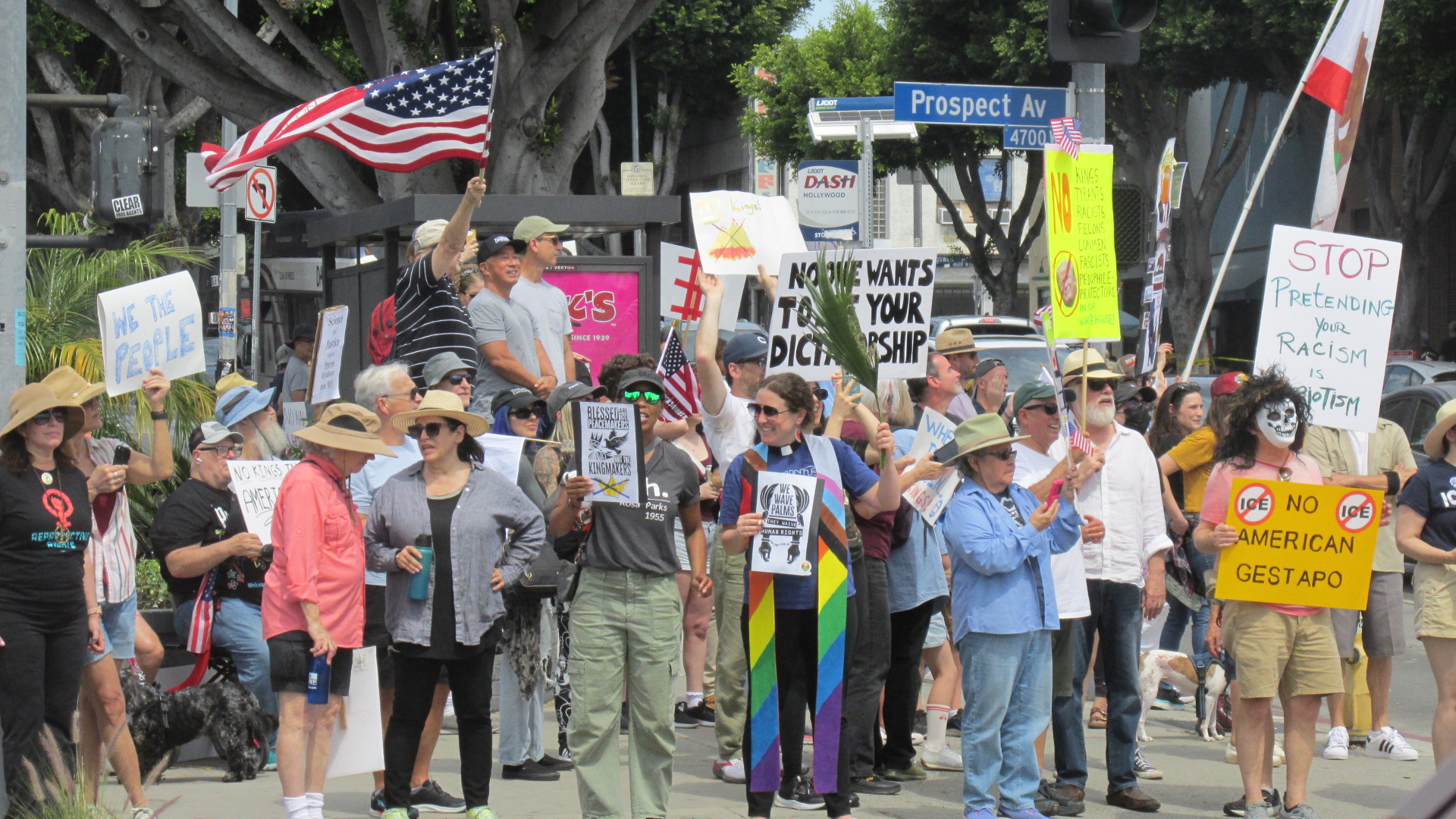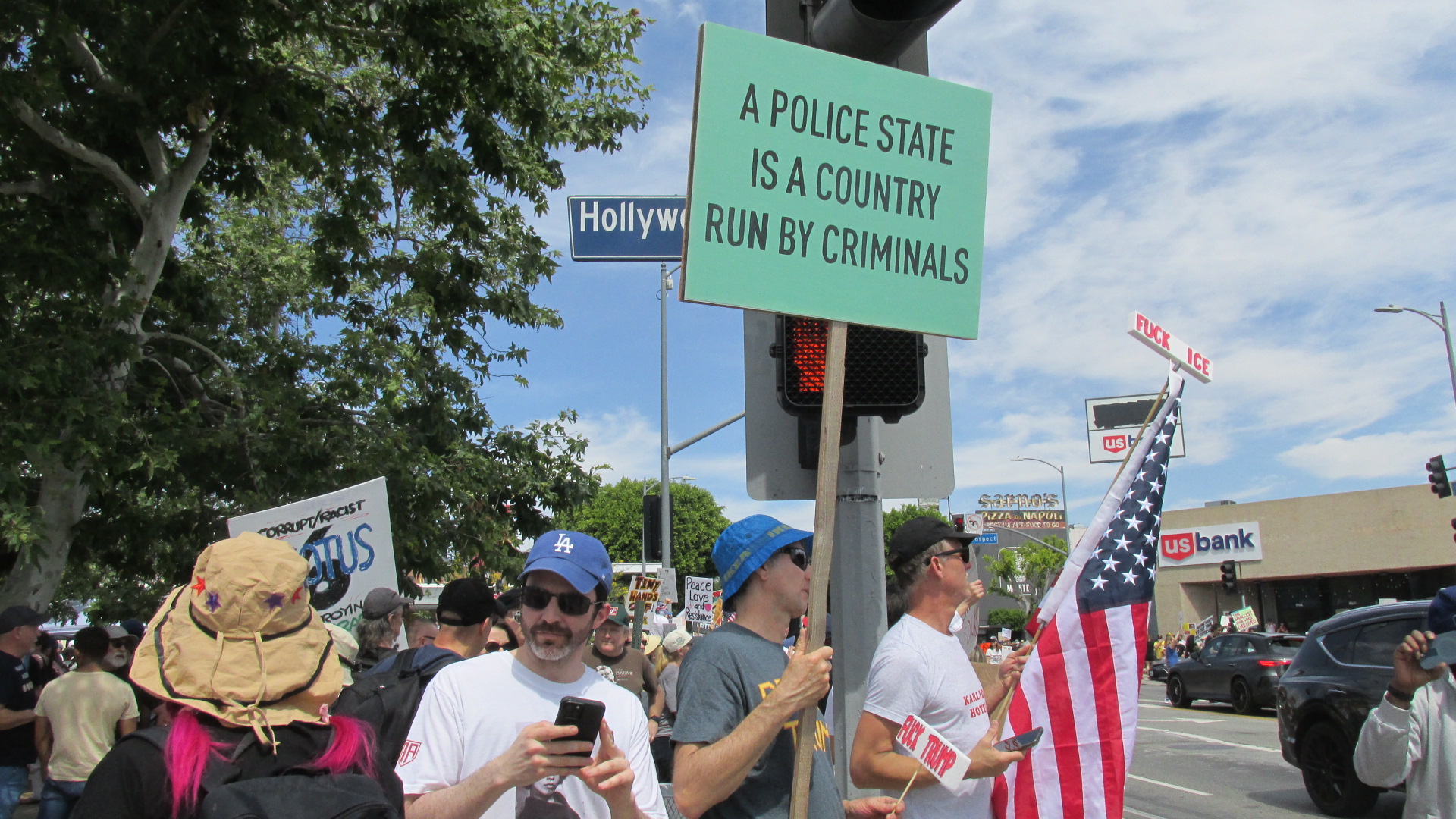 The signs at the Hollywood protest covered a lot of issues.Protesters marched back and forth across the intersection.One woman sat with her hands over her ears. It was pretty loud.