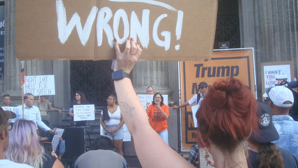 A few hundred protesters gathered in Hollywood on Wednesday night to protest ABC’s decision to pull the Jimmy Kimmel show, at least for the time being. I’ve never seen the show. If I’d heard that he was going off the air for low ratings, it wouldn’t have made any difference to me. But it appears that ABC pulled the show because of pressure from the Trump administration over comments Kimmel made in the wake of the Charlie Kirk shooting. This is really disturbing.