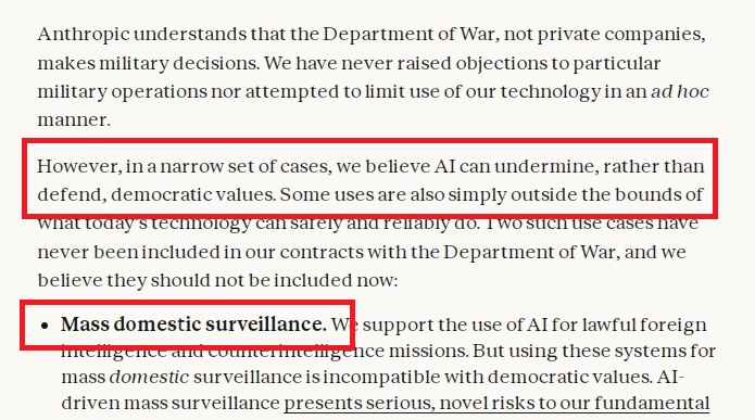 But this is crossing a new line. In this case it appears that the US government is asserting that it has a right to conduct mass surveillance of citizens, and that it will only work with AI companies that are comfortable with that kind of surveillance.