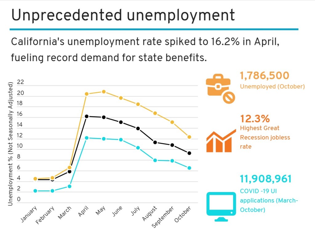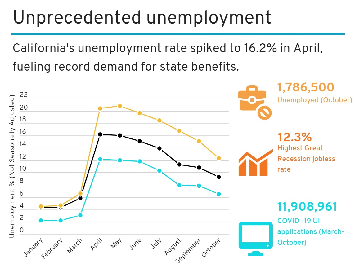 Graph showing California unemployment numbers from CalMatters