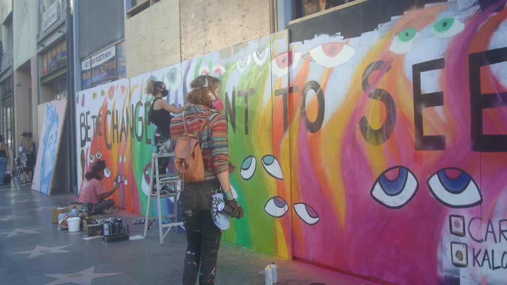 Artists painting murals during the protests in Hollywood this year.