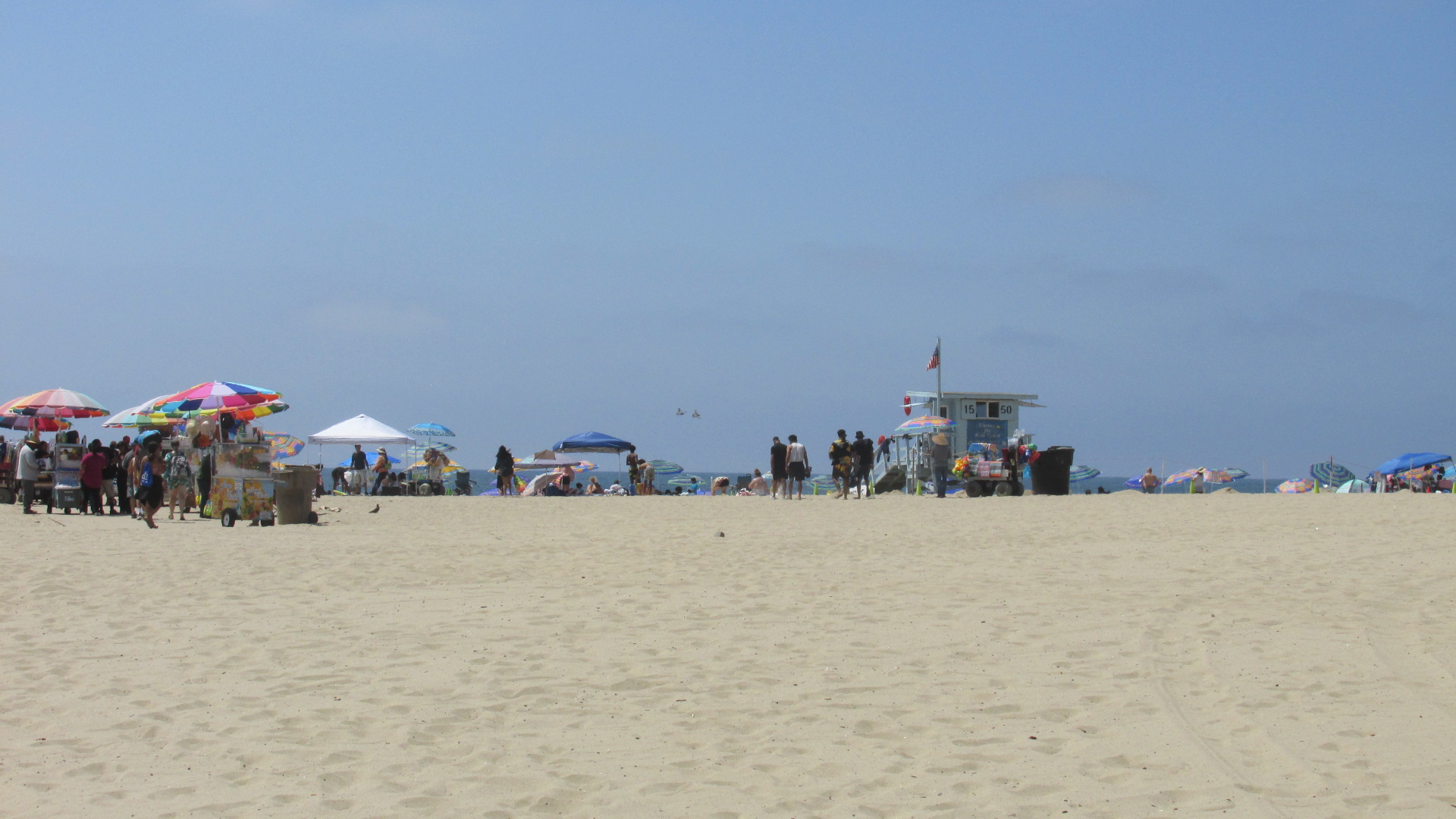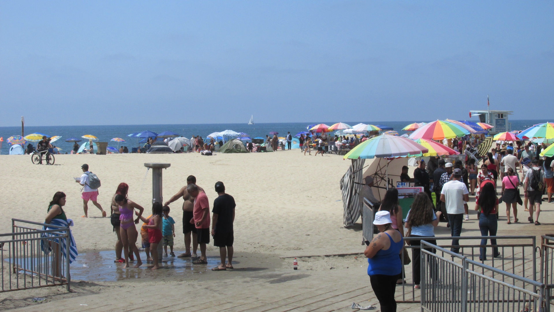 Lots of colorful umbrellas at the beach.A lot of people took the train to Santa Monica, but many others drove.